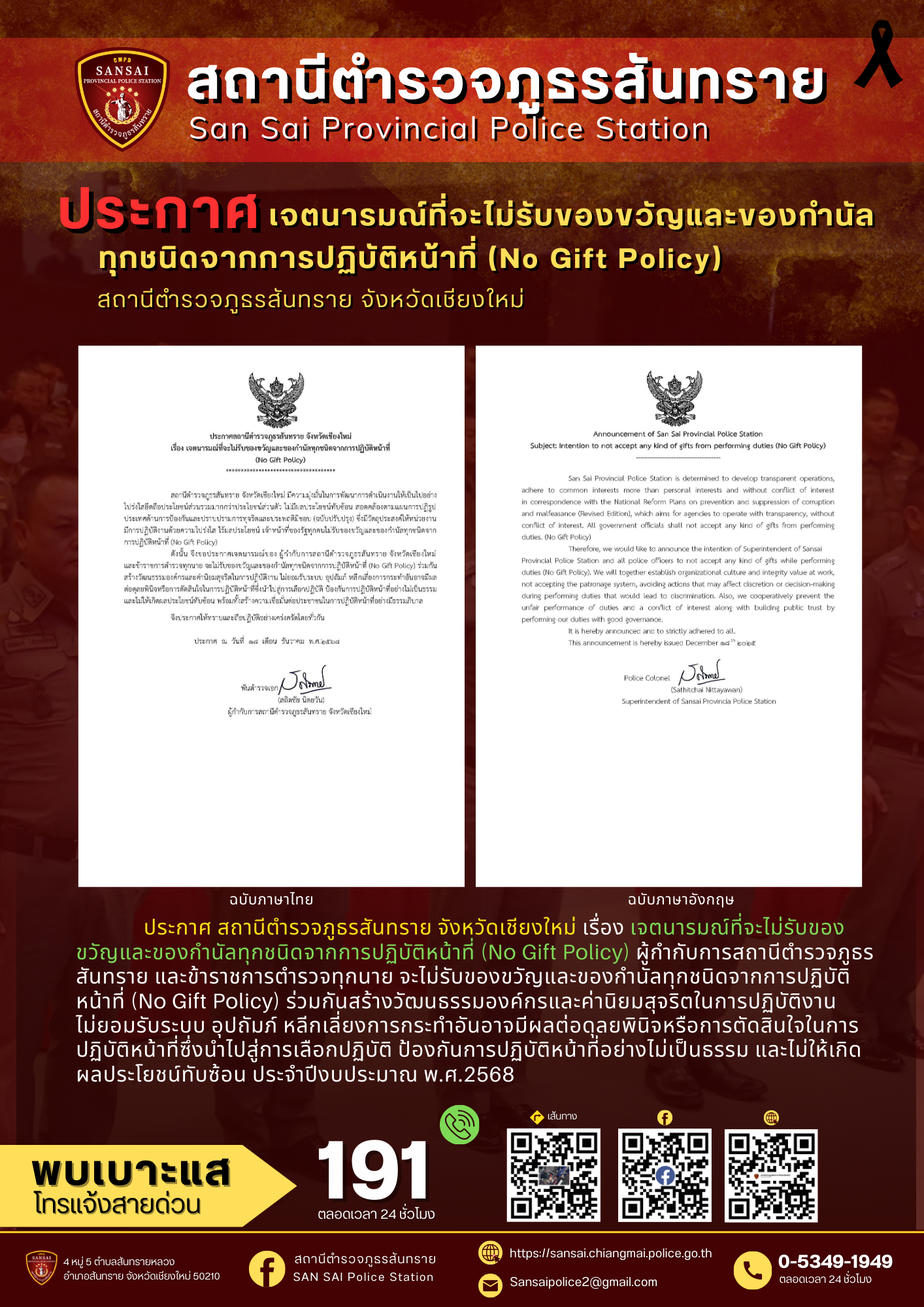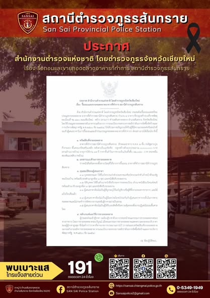 ประกาศ สำนักงานตำรวจแห่งชาติ โดยตำรวจภูธรจังหวัดเชียงใหม่ เรื่อง รื้อถอนและขายทอดตลาดอาคารที่ทำการ สถานีตำรวจภูธรสันทราย